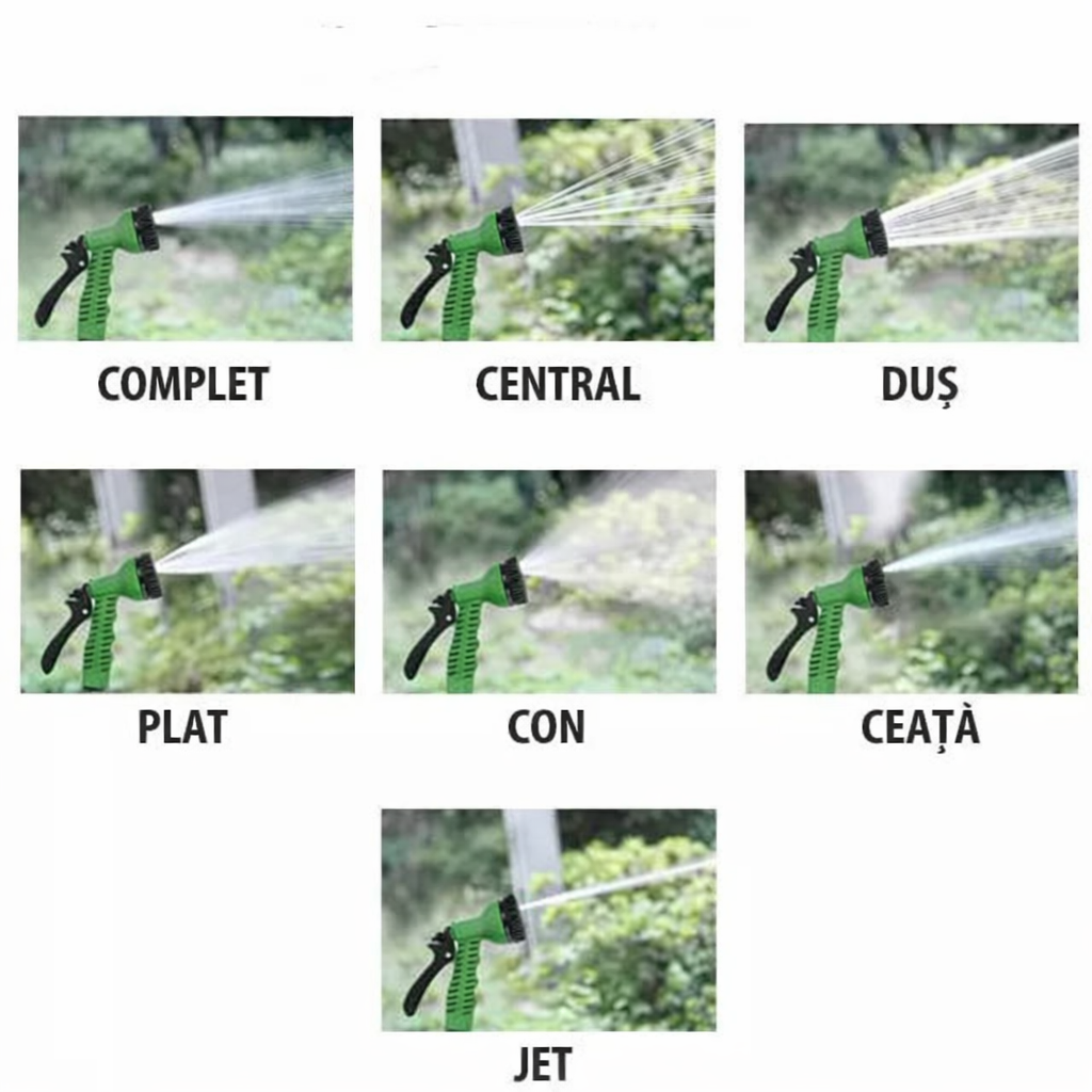 • Pistol multifuncțional cu 7 moduri de stropire – ideal pentru udarea grădinii, florilor sau spălarea mașinii